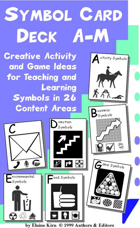 Reading and other language instruction often begins with symbolism—the notion that graphic images can represent (stand for) vocabulary (words, phrases, or ideas). This 52-card deck contains thirteen (13) sets of four-of-a-kind visual symbols (icons and other simple figures) in 26 separate meaning categories, one for each alphabet letter: Activities, Business, Communications, Directions, Environmental, Food, Games, Holidays, International, Justice, Knowledge, Letters, and Math. Card users/players learn or reinforce not only the concept of associating printed images with meaning, but also vocabulary and categorizing.