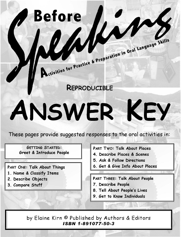(The Student Text that this Answer Key is based on is called BEFORE SPEAKING: Activities for Practice & Preparation in Oral Language Skills [ISBN 978-1-891077-50-0]. Other Oral-Skills Texts have supplementary material with similar purposes, such as the Beginners' BEFORE SPEAKING with PRONUNCIATION PRACTICE Answer Key [ISBN 978-1-934637-27-2])