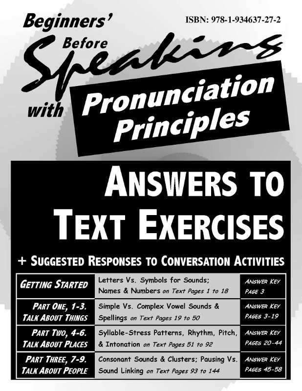 (The same Answer Key is part of each Student Text in Beginners' BEFORE SPEAKING with PRONUNCIATION PRINCIPLES with inbound Answer Key [978-1-934637-26-5]. The available 150-page BegBeSpw Pr Pr Teachers' & Learners' Guide [ISBN 978-1-934637-28-9] includes the material of the 60-page Answer Key, along with instructions and creative ideas for making classroom use of the text. There are also extensive reference sections to help teachers and advancing students complete the Challenge sections of the Text productively. And finally, three 70-minute CDs [978-1-934637-29-6] will help non-native speakers of English with pronunciation and accent improvement.)