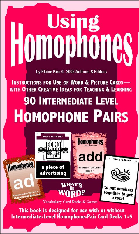 Accompanying the Intermediate Decks is a 44-page reproducible teacher-resource Activity & Idea Book. It explains why homophones exist in English, how to teach or learn them, how to play cooperative or competitive games with two-sided cards, and how to make productive use the materials in large classes, learning groups, and for independent study. There are Vocabulary in Context Charts to complete (with Answer Keys), level-appropriate homophone quizzes and stories, and reference lists of homophone pairs at three levels of difficulty.