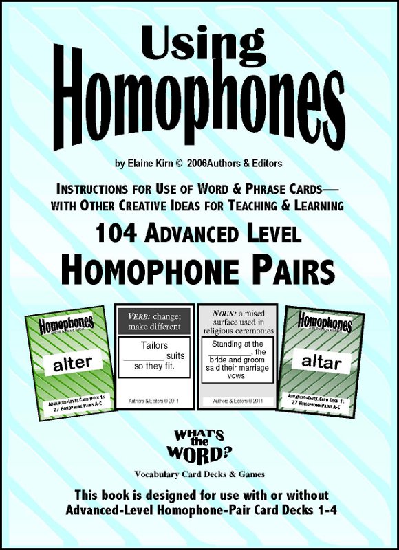 (Also available are Beginning Homophone Card Decks 1-6 [90 Word Pairs) and Intermediate Homophone Card Decks 7-11 [90 Word Pairs]. The Activity & Idea Book that accompanies each level has some information similar to and some material different from that of the other two books. )