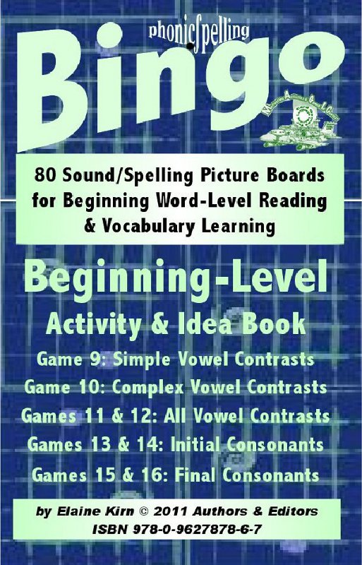 (For a "lower level" set of comparable materials, see Phonics BINGO 1, Basic (Literacy) Level, ISBN 978-0-9627878-56-0, which contrasts only nine picture items with "very simple spellings" per Game. Or work with the eighty 25-Box Word & Picture Grids of Phonics BINGO 3, Intermediate Level, ISBN 978-0-9627878-7-4--or the eighty 36-Box One- and Multi-Syllable Word Grids of Phonics BINGO 4, Advanced Level, ISBN 978-0-9627878-8-1. Make maximum use of the unique Activity & Idea Book that accompanies each set: it contains not only general info and instructions common to multiple levels of phonics/spelling instruction, but also Answer Keys, Reference Charts, and activity ideas based on those particular materials.)