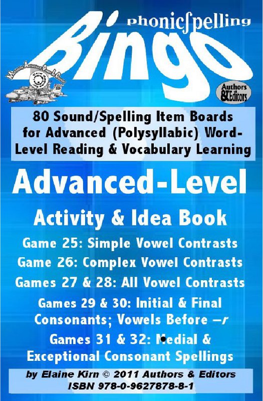 (Not yet ready for Advanced-Level phonics and spelling lessons? Then you might be interested in lower-level Phonics BINGO sets. See BINGO 1, Basic (Literacy) Level, ISBN 978-0-9627878-56-0, which contrasts only nine picture items with "very simple spellings" per Game. Or try out BINGO 2, Beginning Level, ISBN 978-0-9627878-6-7, which offers 16 contrasting Word & Picture Items per Grid--all of which contain common or alternative regular spellings for the targeted sounds. Or take a look at Phonics BINGO 3, Intermediate Level, ISBN 978-0-9627878-7-4, containing the most "advanced" items for teaching/learning all but exceptional spellings in one-syllable words. Some of the offerings of each of the four Activity & Idea Books are the same; others have been adapted to the Level they accompany.)