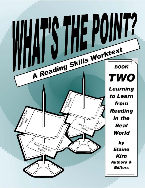 (Whether the "lower-level" WHAT'S THE POINT? Book One, subtitled Beginning to Read for Meaning [978-1-891077-02-9], is more or less "challenging" than Book Two is debatable. Because the point of the reading-skills system is for students to read for meaning from the start, Book One contains no instruction in decoding words or analyzing grammar. Instead, it is a unique "Reading Skills & Strategies Primer." That's because it teaches learners how to read and understand a variety of adapted reading-matter types--like "Signs & Symbols," "Visuals" (Photos, Drawings, Cartoons), "One-Liners" (Proverbs, Quotes), "Short Fiction," "True Stories," "Humor," "Personal Communication," etc. before they are presented with the "Factual Text-Like Information" of expository prose. Two CDs are available to help out non-native speakers of English and new readers.)