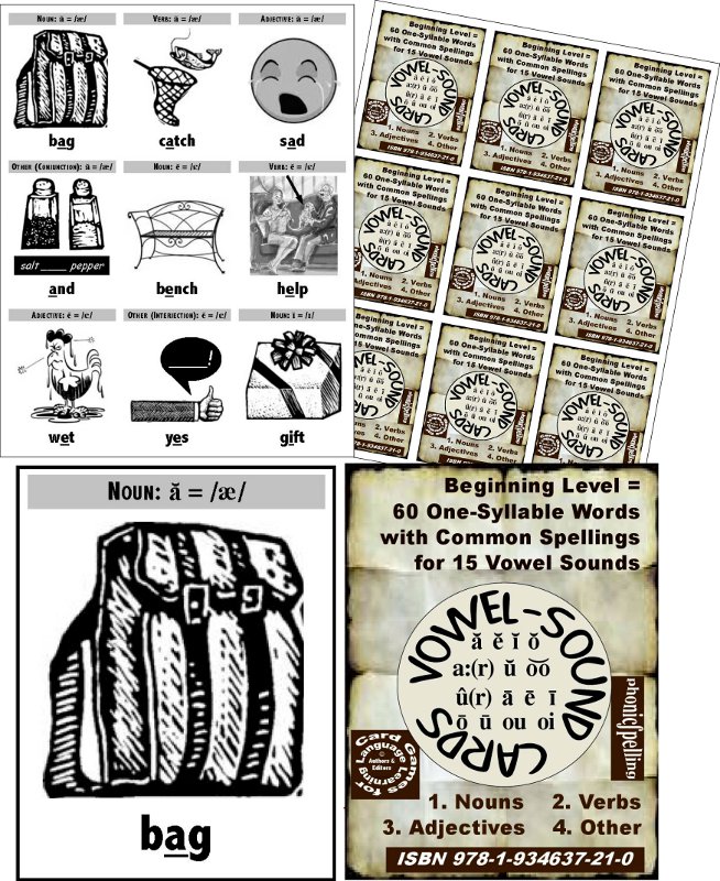 VOWEL SOUNDS & SPELLINGS 1, Beginning Level = 60-Card Pack with the Most Common Spellings for 15 Basic Vowel Sounds + 90-Page Activity & Idea Book